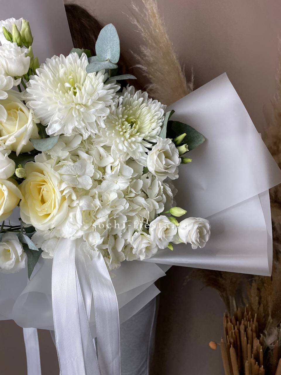 гортензия, бомбастик, диантусы, эвкалипт, антиринум, хризантема, пленка.