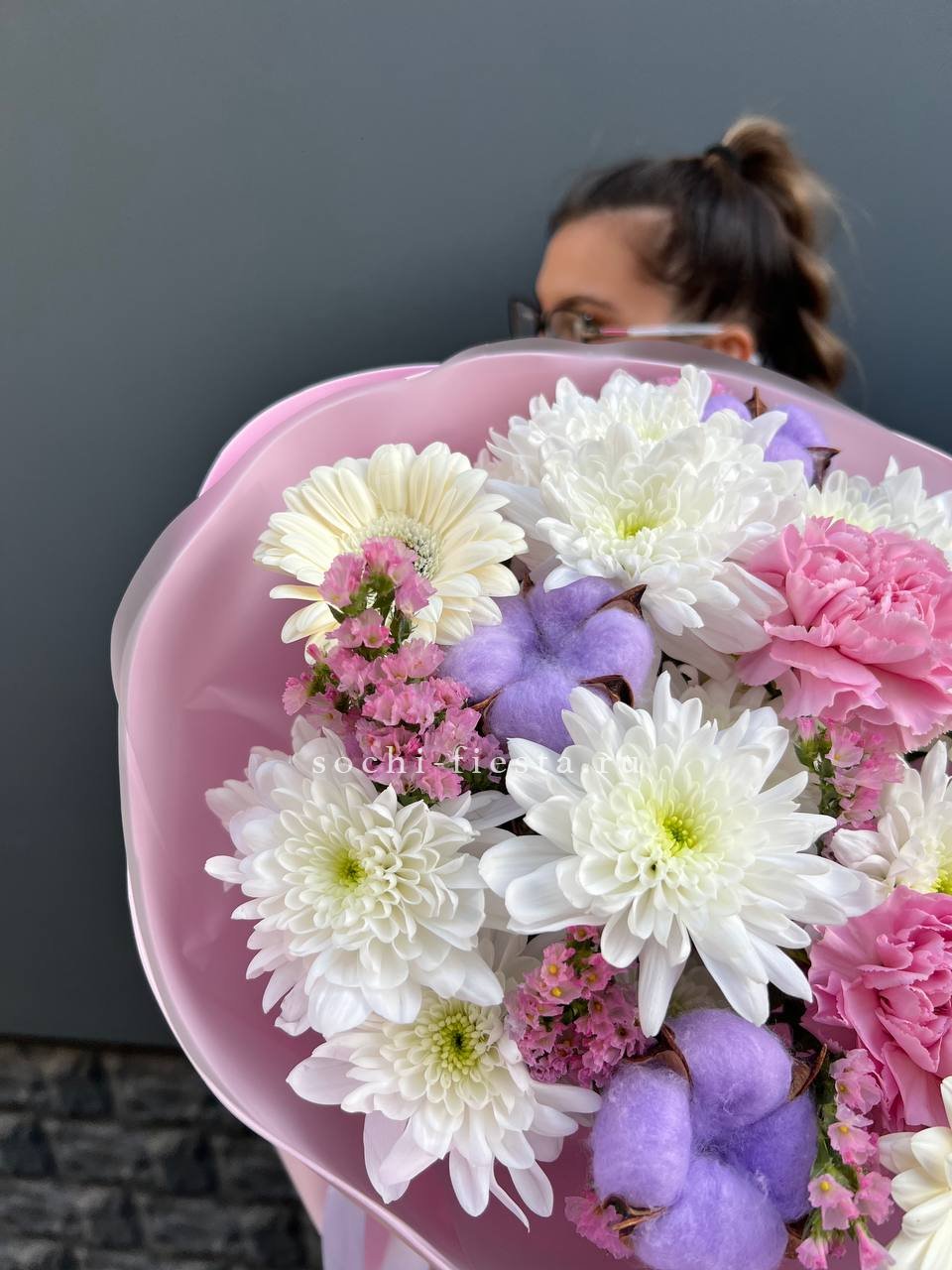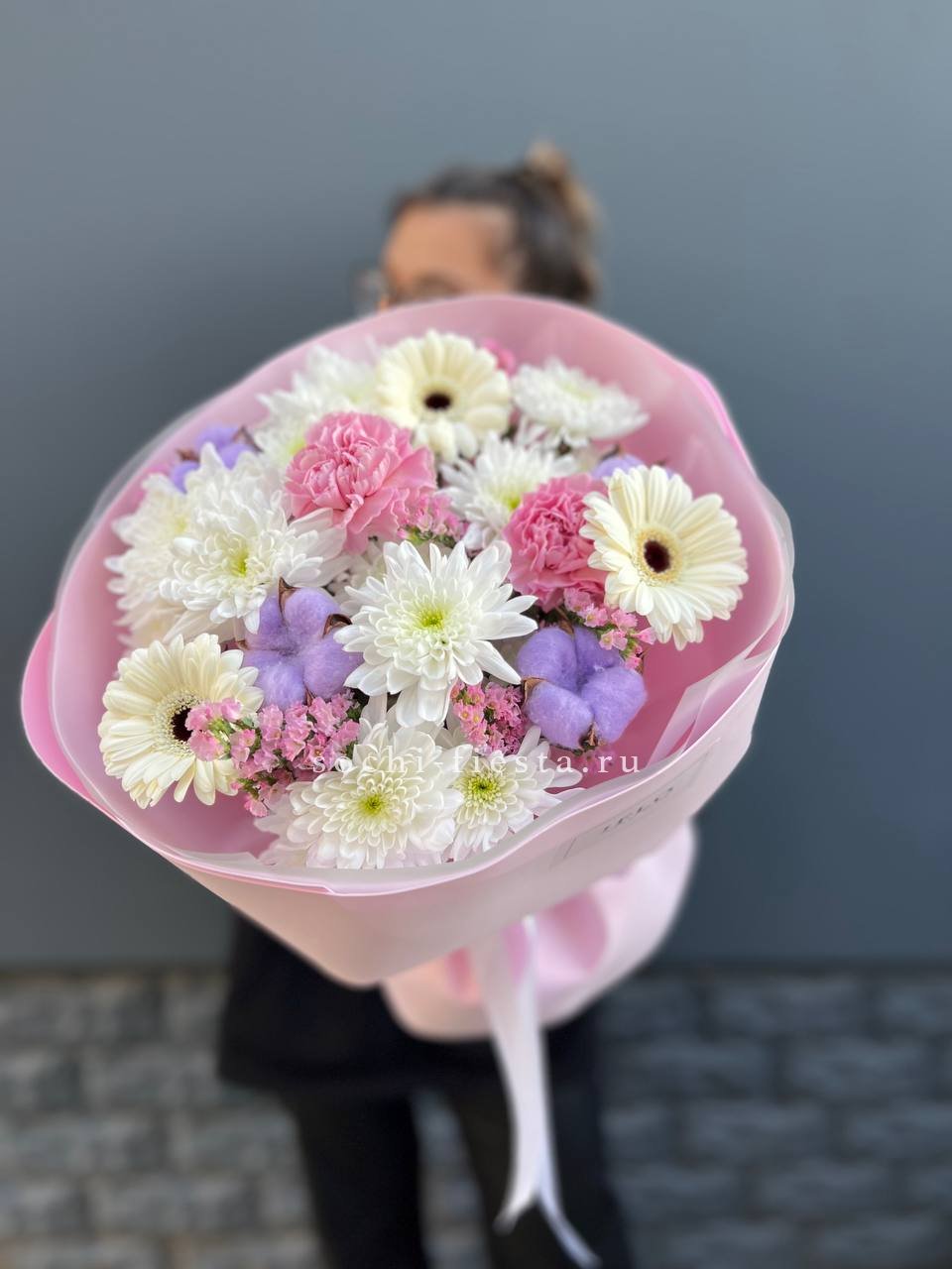 хризантема кустовая, гортензия, мисти баблс, розы в нежном оформлении.