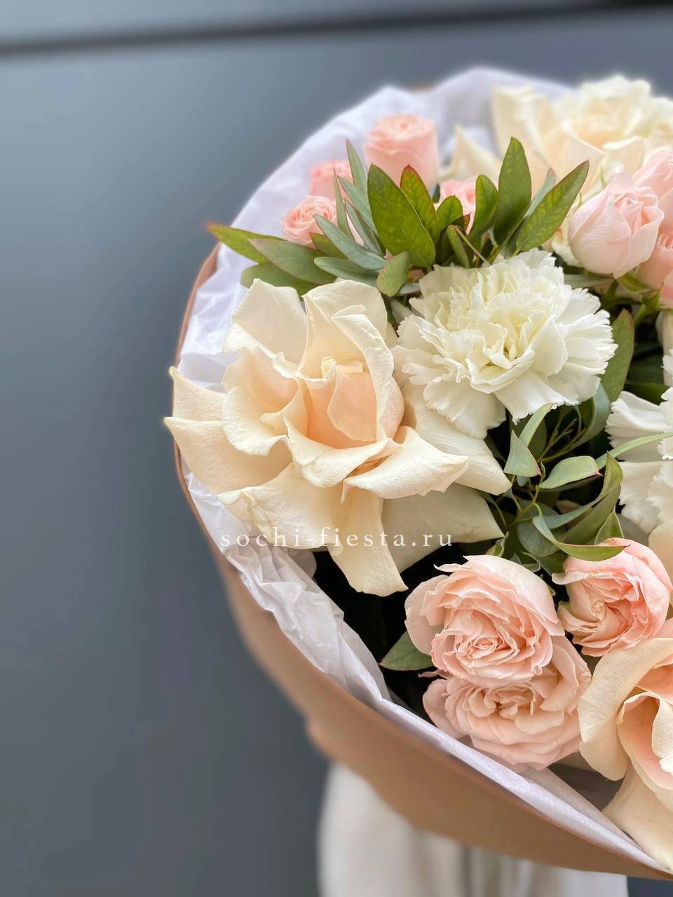 кустовые розы, кремовые розы, диантусы, эвкалипт лента и дизайнерская пленка.