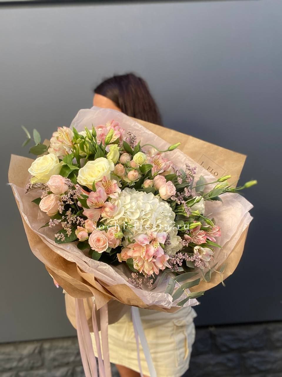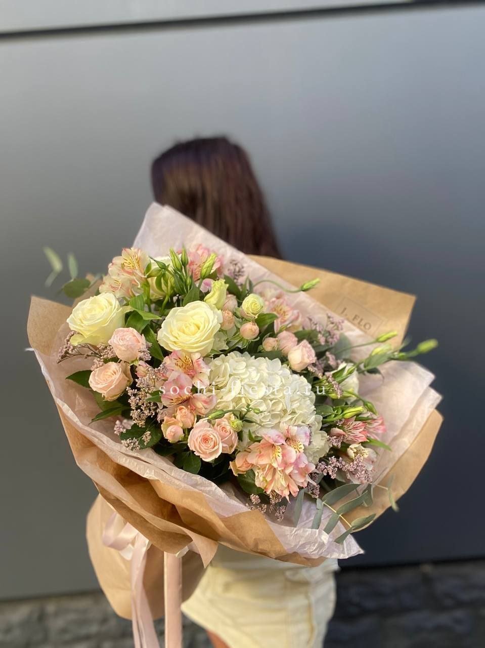 роза одноголовая, кустовая роза, альстромерия, гортензия, эустома, эвкалипт, декоративная зелень, лента, крафт.